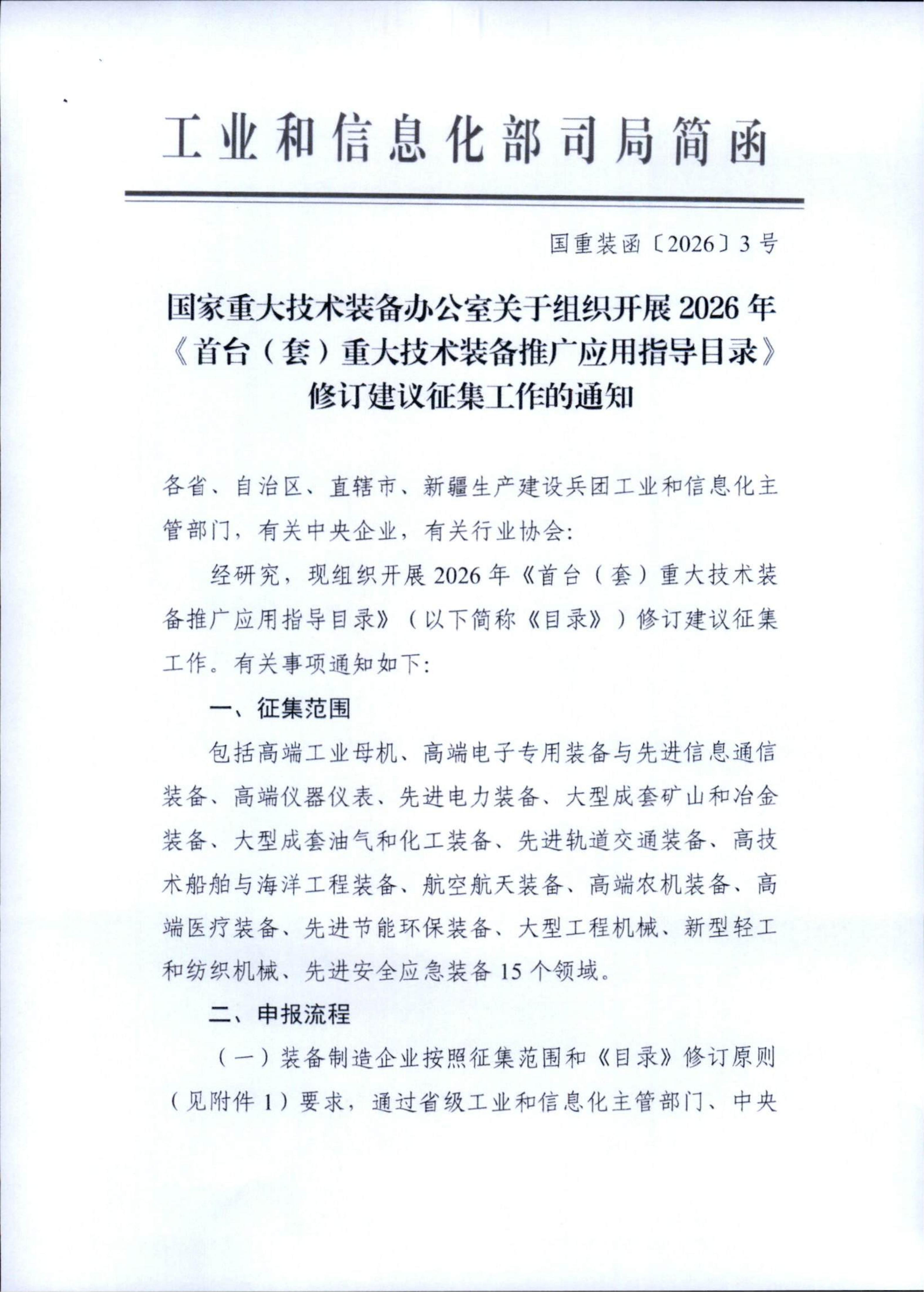 附件:国家重大技术装备办公室关于组织开展2026年《首台(套)重大技术装备推广应用指导目录》修订建议征集工作的通知(国重装函〔2026〕3号)