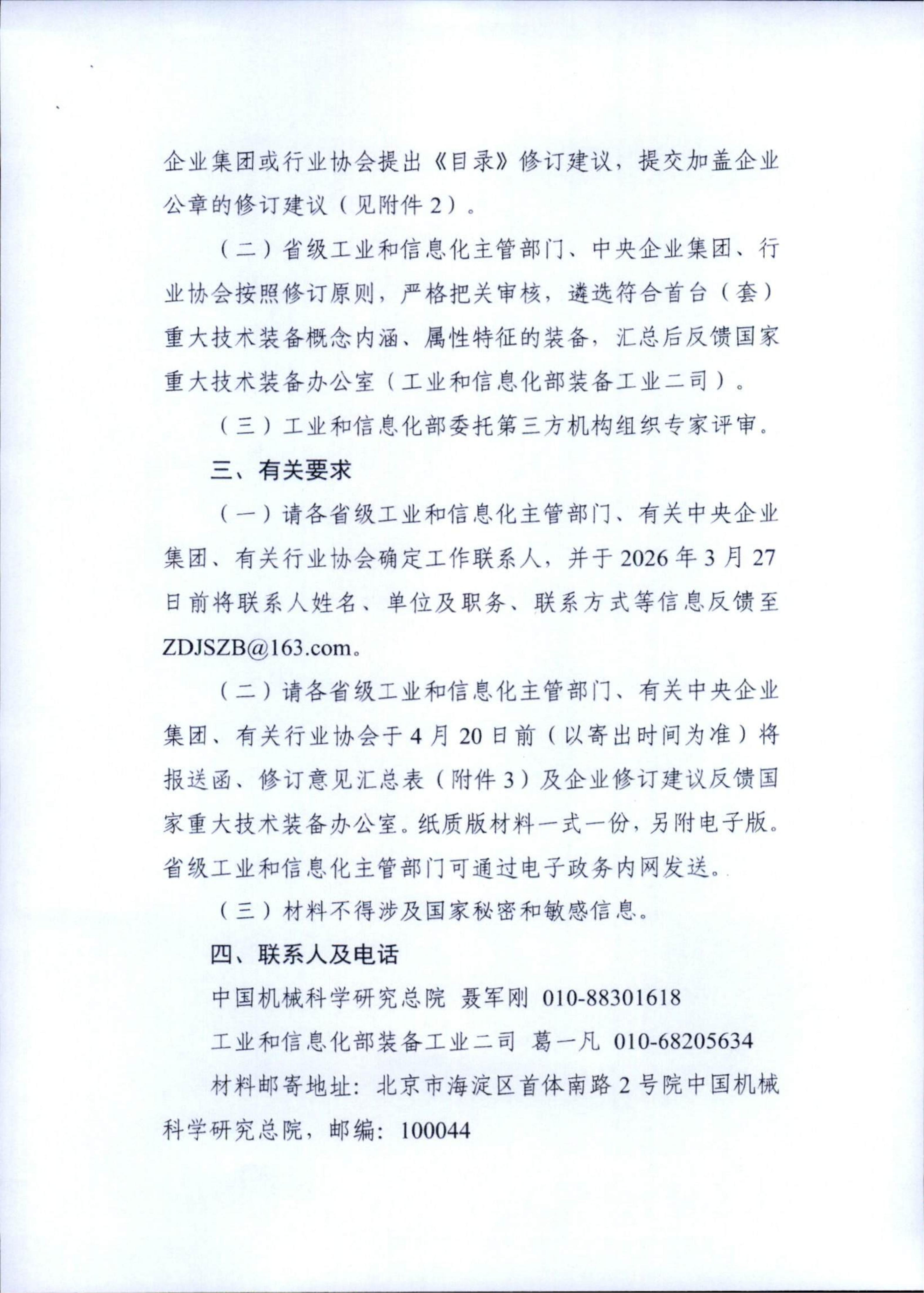 三、请对企业材料进行审核把关,择优遴选,于2026年4月8日前正式行文,连同《〈目录〉修订建议汇总表》(见《通知》附件3)及企业修订建议材料(纸质版一式二份,附电子版)一并报送至我厅(装备工业处),逾期不予受理。材料不得涉及国家秘密和敏感信息。